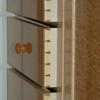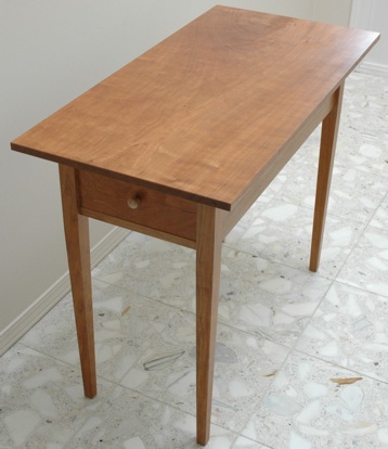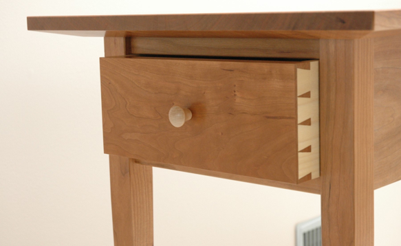 Solid cherry legs, aprons, top and drawer fronts with poplar drawer sides and maple pulls. Traditional joinery of handcut mortises, tenons, grooves and splines throughout. Handcut dovetailed drawers fit precisely to drawer openings.